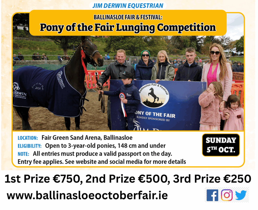 Join us for a spectacular showcase of Ireland’s finest 3-year-old ponies, with top competitors vying for prestigious prizes. Don’t miss this exciting day at Ballinasloe’s historic Fair Green!